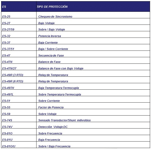Las Funciones de protección que tiene el equipo para Generador es el siguiente: